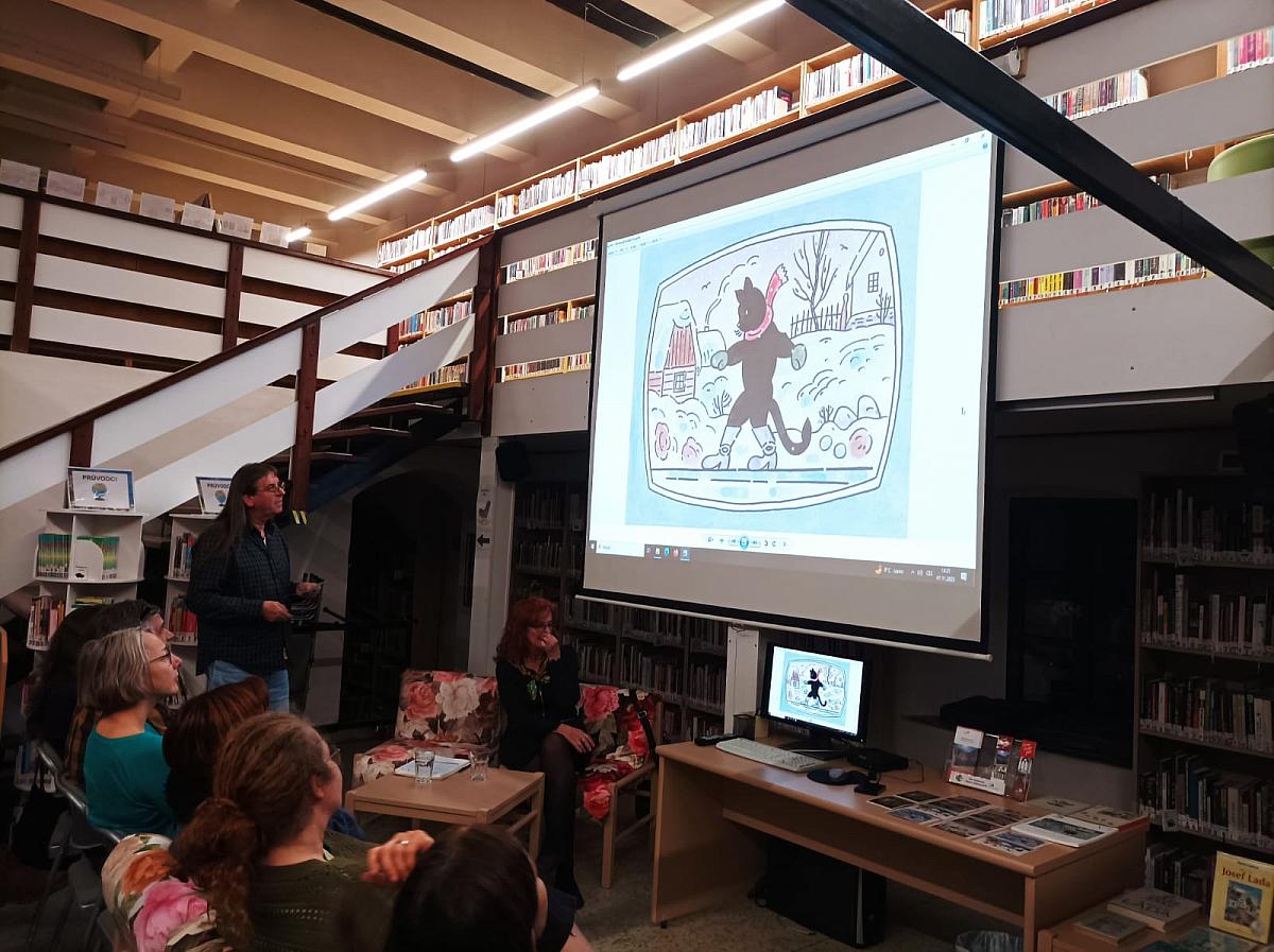 V páteční podvečer 7. listopadu se v rámci 1. ročníku celostátní přehlídky amatérského divadla pro děti a mládež Divadelní Fimfárum konala v oddělení pro dospělé poutavá beseda s panem Josefem Ladou ml. – synem známé české ilustrátorky Aleny Ladové – uspořádaná při příležitosti stého výročí narození této mimořádně významné české výtvarnice. Čtyřicítka návštěvníků, která zcela zaplnila přednáškovou část dospělého oddělení, si poslechla velmi zajímavé vyprávění nejen o tvorbě této jedinečné osobnosti – dcery slavného malíře, ilustrátora, karikaturisty a spisovatele Josefa Lady – ale zároveň se dozvěděla i mnoho zajímavostí z jejího života. Nechyběl ani prostor pro zvídavé dotazy, kterých se sešla celá řada, a na které pan Josef Lada ml. ochotně odpovídal. Beseda se velmi vydařila – návštěvníci odcházeli obohaceni o mnoho nových poznatků a s úsměvem na tváři z milého setkání.