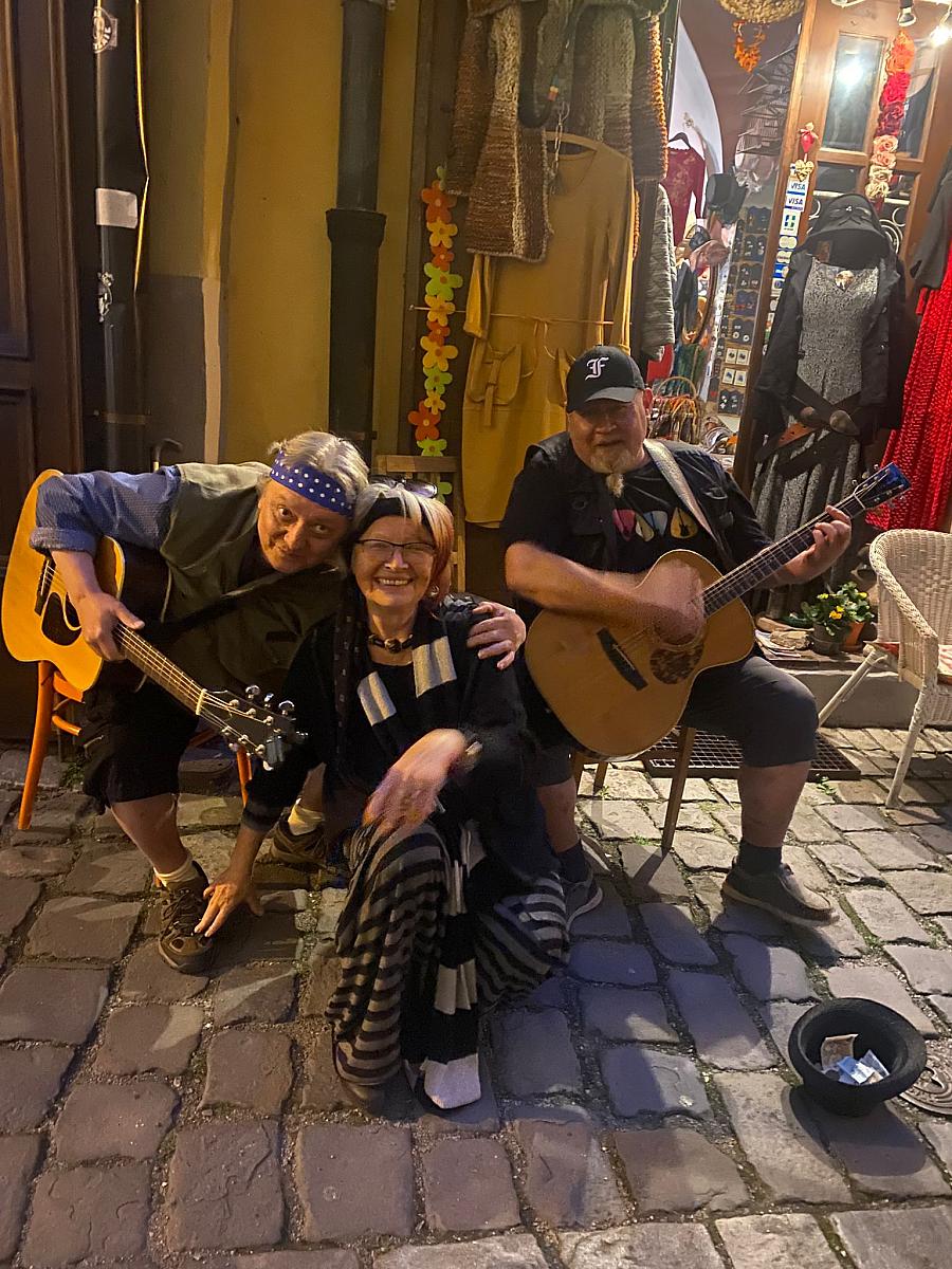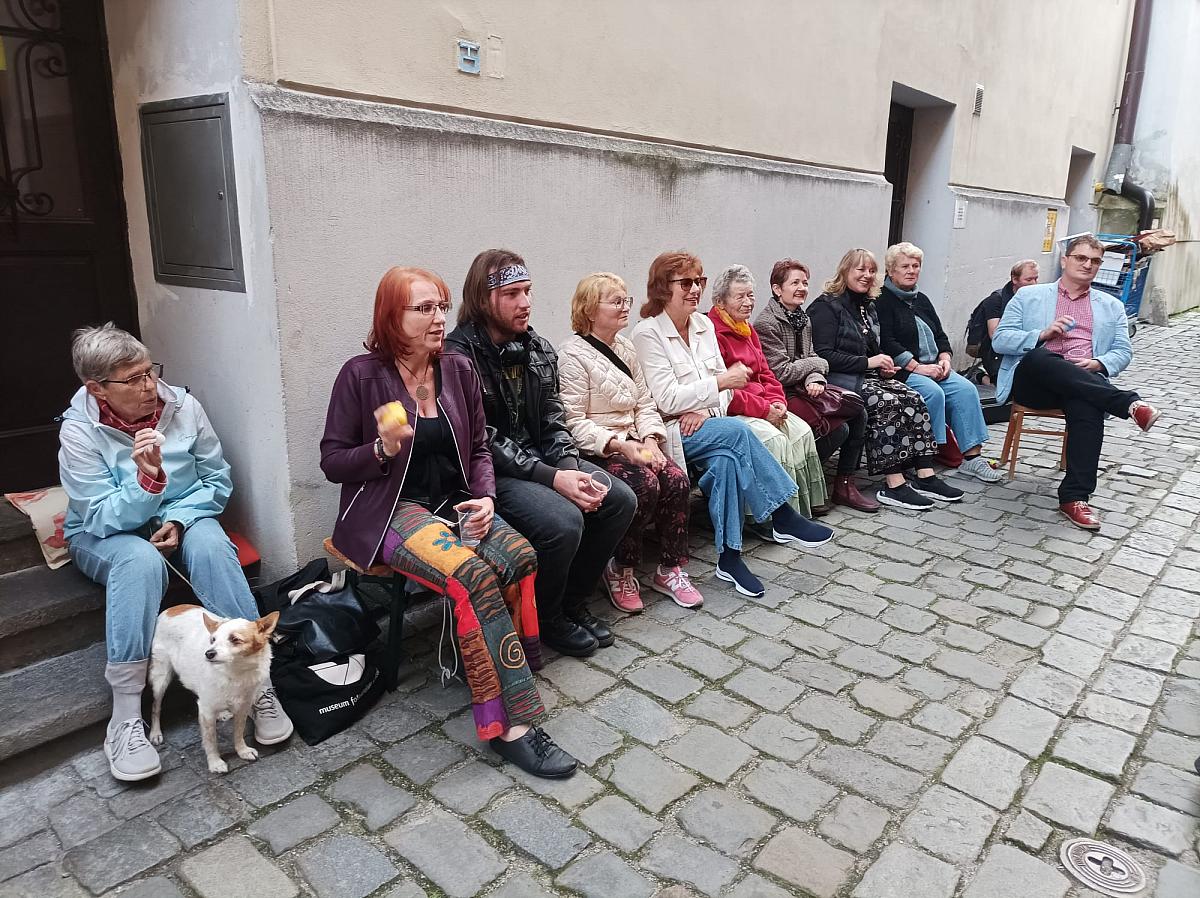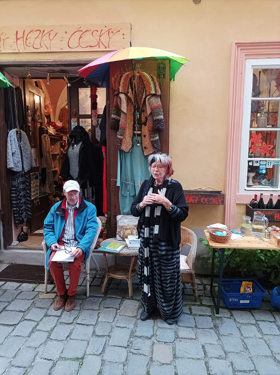 Zářijovým Čteme Hezky Česky jsme se v Soukenické ulici u krámku Jarky Dominové připojili ve středu 17. 9. k jedinečné celostátní akci Noc literatury. Četl nám všem dobře známý krumlovský moderátor a amatérský divadelní herec Petr Kronika, jehož libý přednes nás tak vtáhnul do děje knihy romské spisovatelky Eleny Lackové „Narodila jsem se pod šťastnou hvězdou“, že jsme ani nedutali! Po čtení se ještě dlouho povídalo a hrálo (skvělé kytarové duo Martin Sam Korčák a David Rajdl) a Soukenická ulice se tak opět proměnila v místo milého komunitního setkání. Celého večera se zúčastnil i nový pan ředitel českokrumlovské knihovny Bc. Jan Polívka, který byl z jeho průběhu nadšen – komunitním a kulturním aktivitám naší knihovny je, stejně jako bývalý pan ředitel, Mgr. Martin Nechvíle, velmi nakloněn. Další Čteme Hezky Česky se uskuteční 15. října – tentokráte už v Gotickém sále knihovny. Těšíme se na Vás!