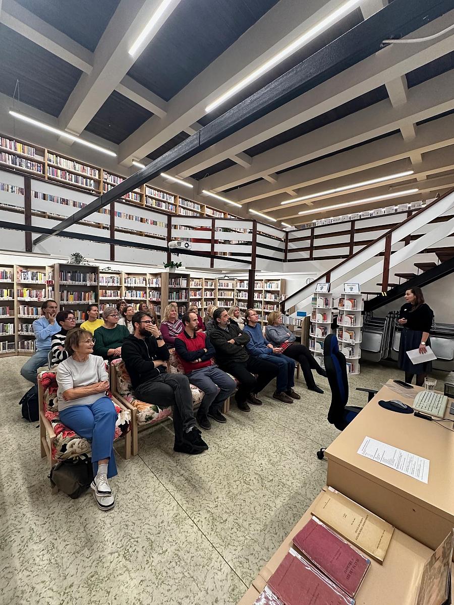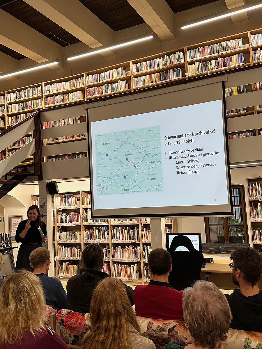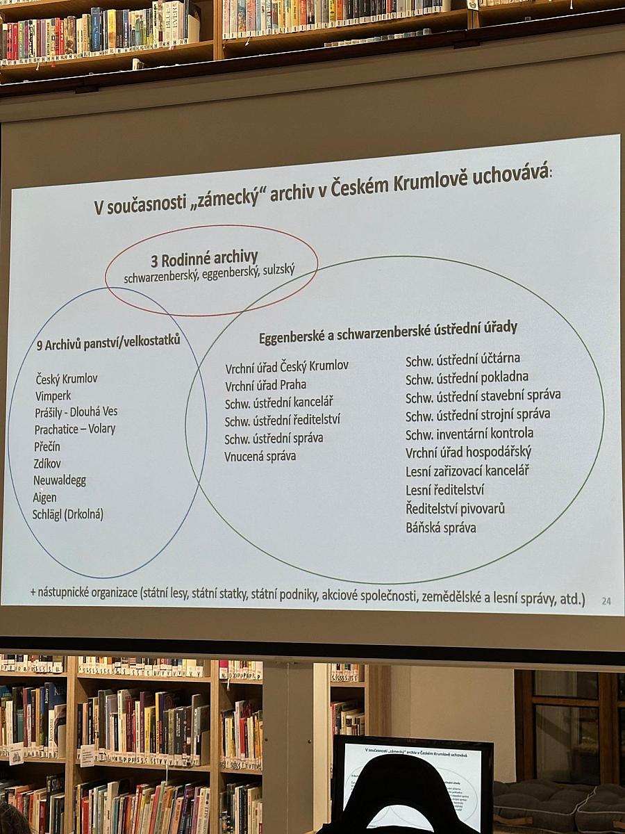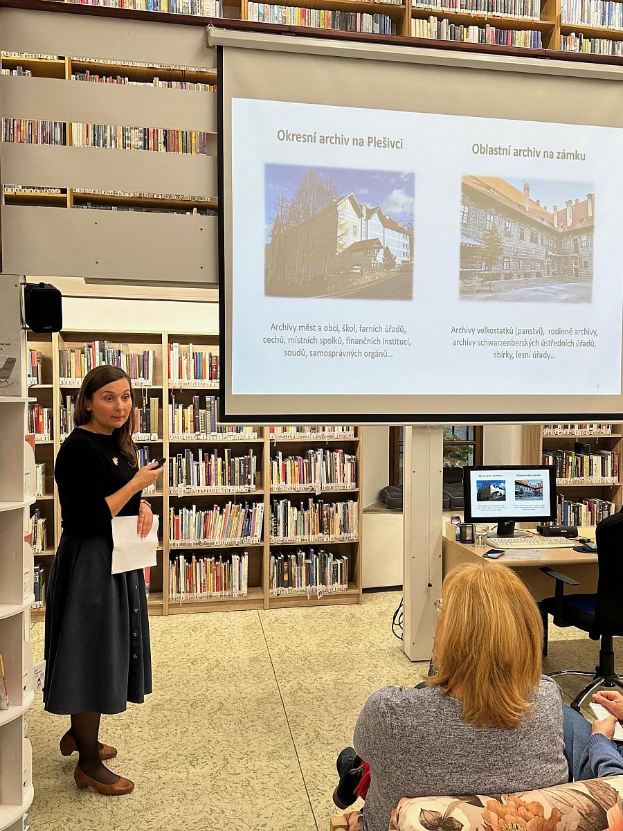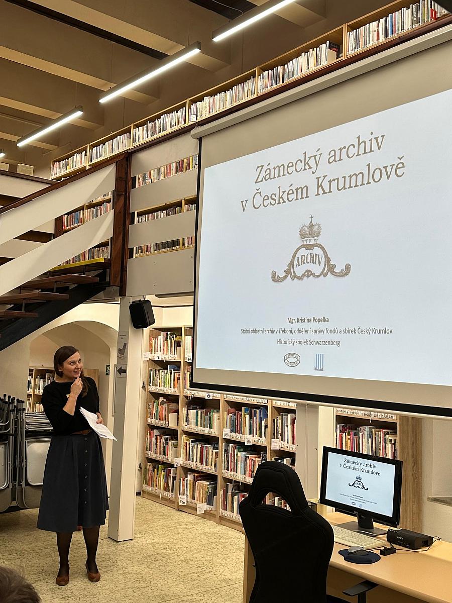 V úterý 14. října 2025 se v oddělení pro dospělé Městské knihovny v Českém Krumlově uskutečnila poutavá přednáška určená pro širokou veřejnost. Naším hostem byla Mgr. Kristina Popelka ze Státního oblastního archivu v Třeboni, vedoucí oddělení správy fondů a sbírek Český Krumlov.