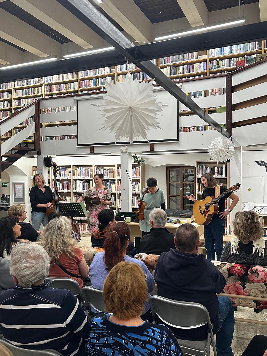 V městské knihovně se sešli příznivci kvalitní muziky na novoročním koncertu českokrumlovské kapely Lakomá Barka. Tato stálice místní hudební scény se v příštím roce chystá oslavit těžko uvěřitelné výročí a je znát, že holkám to hraje čím dál lépe.