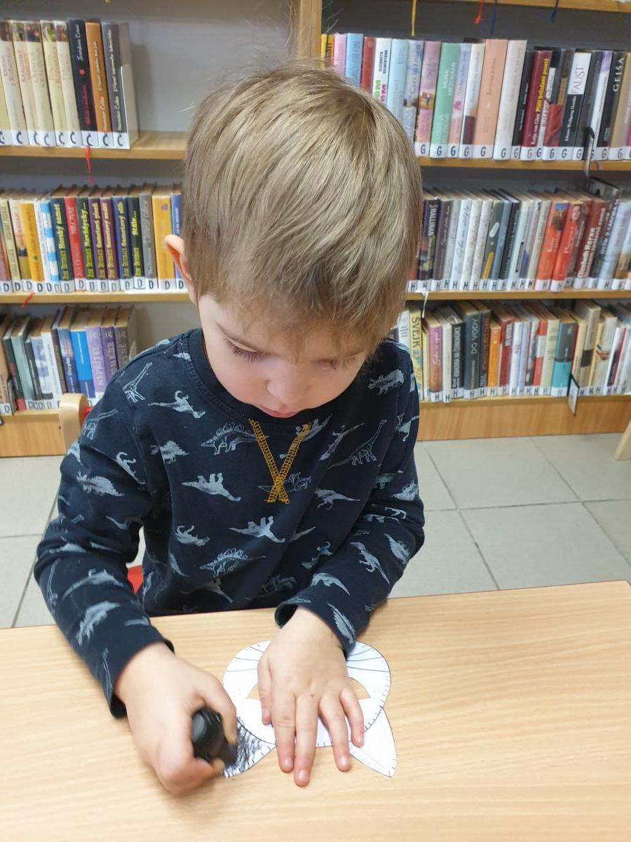 Na závěr si každý vybarvil svou vlastní masku kočičky nebo kocourk. A velké díky patří dětem za krásného sněhuláka, který nyní bude zdobit knihovnu.