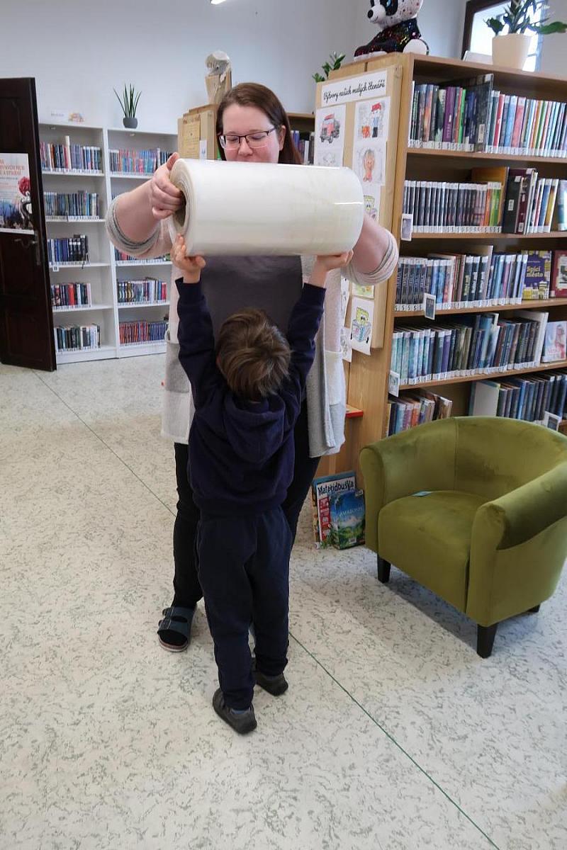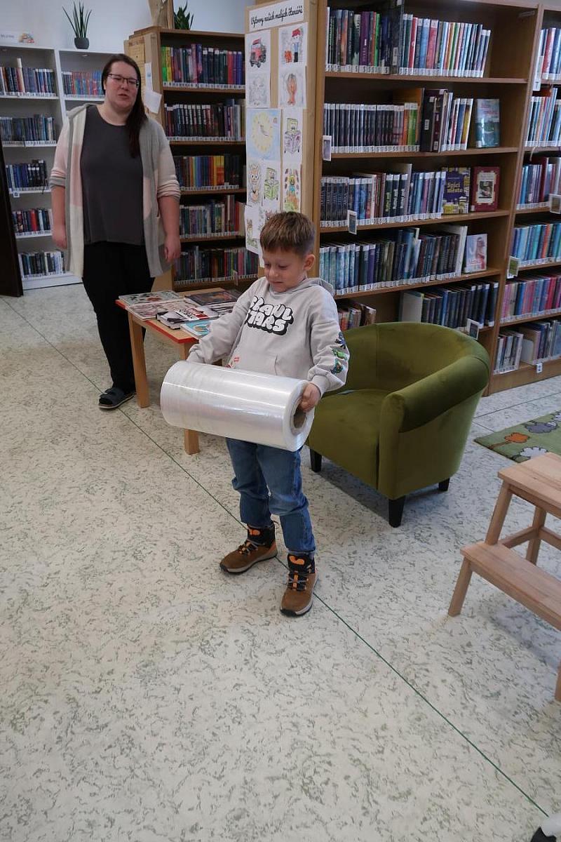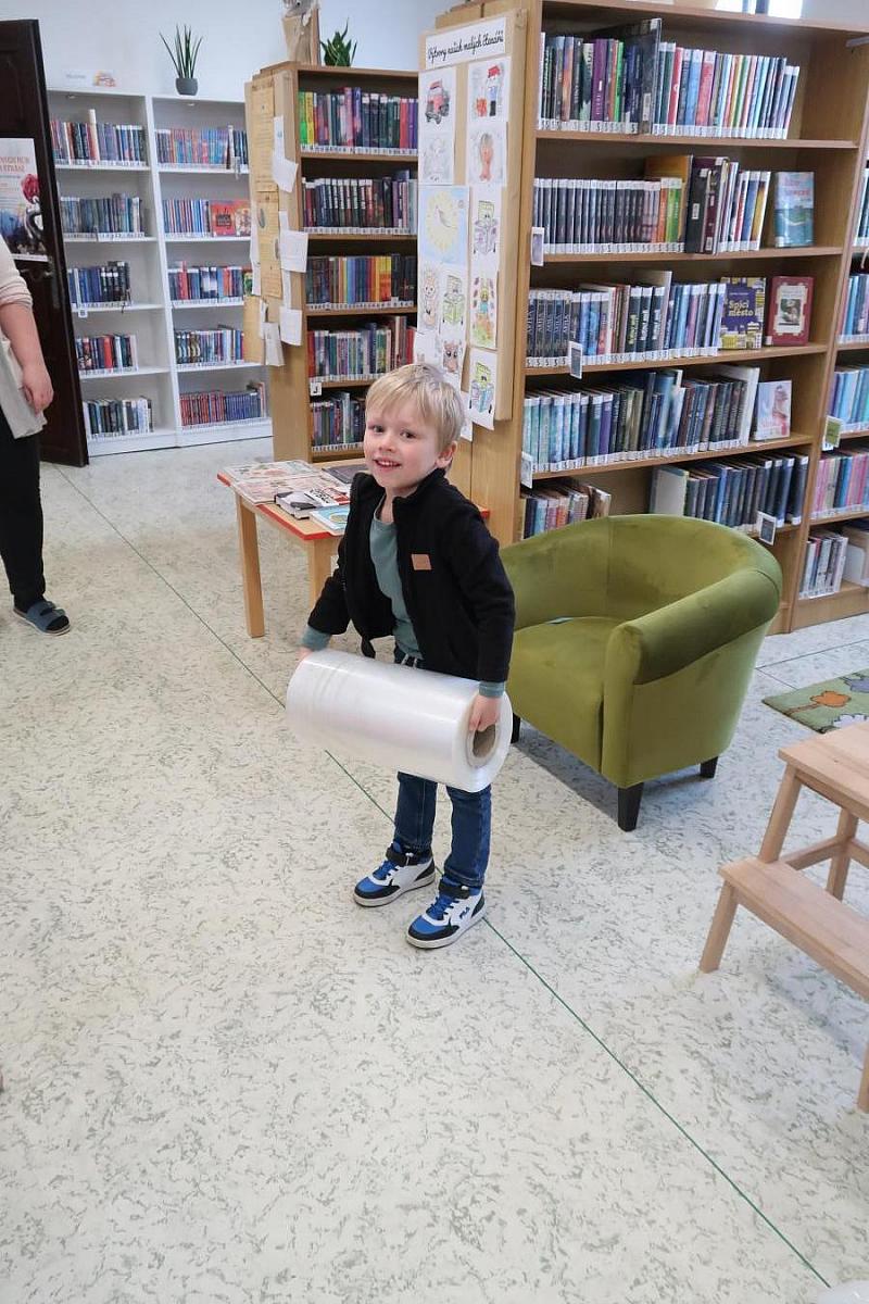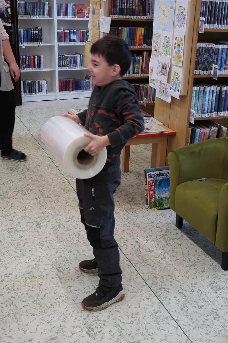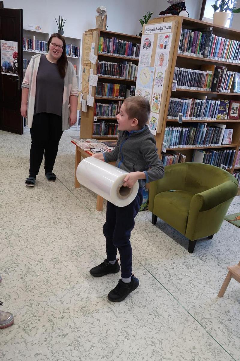 Děti si také připomněly, jak se o knížky správně starat, aby nám vydržely co nejdéle a mohly rozdávat radost dalším čtenářům. Na závěr si všichni vyzkoušeli práci knihovníka: zvedli těžkou roli obalovací fólie a každý si načetl svou knížku pomocí scanneru. Pro mnohé to byl úplně první kontakt s knihovnou.
